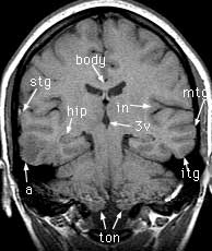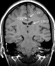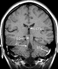 T1 coronals pre-gad Findings: Focus of low signal in the cortex of the right middle and inferior temporal gyri (a). Cerebral aqueduct (aq) leading from the 3rd (3v) to the 4th (4v) ventricle. Crus of the fornix (crus). Flow enhancement in the sigmoid sinus (sig). Superior (stg), middle (mtg) and inferior (itg) temporal gyri. Hippocampus (hip). Body of the corpus callosum (body). Insula (in). Cerebellar tonsils (ton). Cingulate gyrus (cgy) and sulcus (csu). Body of the caudate nucleus (caud). Horizontal fissure (hor).