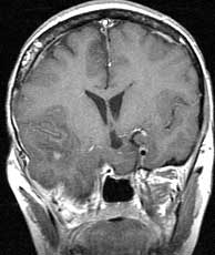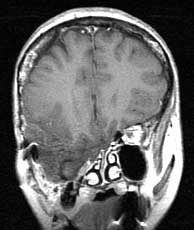 Herniation of the right temporal lobe into the infratemporal fossa with no abnormal enhancement. A few scattered foci of increased signal unchanged compared to pre-gad coronals.