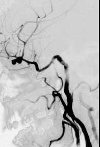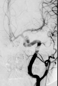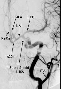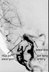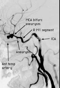 RCC angio Towne, RCC angio lat, LCC angio Towne Findings: RCC angio shows the ICA follows an aberrent course, dipping inferiorly then laterally with no right A1 segment. A lobulated aneurysm involves the right MCA bifurcation. A second smaller aneurysm is present at the origin of the anterior temporal branch off the distal M1 segment. The normal left CC angiogram is shown for comparison.