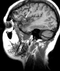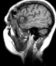 Mixed signal mass (a) in the left Sylvian fissure with surrounding low signal encephalomalacia.