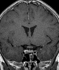 Bright signal lesion posterior and inferior to the optic chiasm unchanged compared to 15 months earlier.