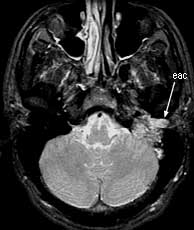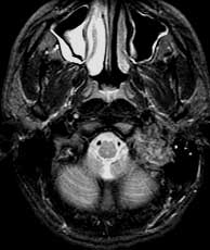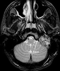 T2 SE axials Findings: Mostly bright signal mass in the left medial skull base which abuts the basiocciput (basi) and invades the left external auditory canal (eac). The mass has several linear and curvilinear foci of decreased signal within.