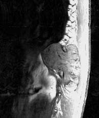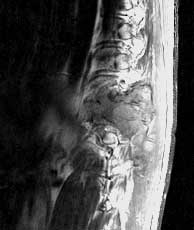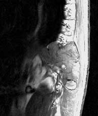 Extensive soft tissue mass in the left paraspinal and chest wall region with mixed signal.