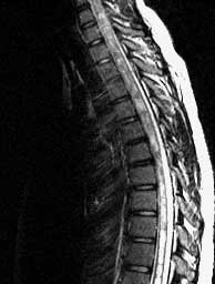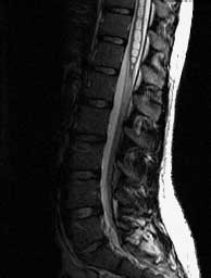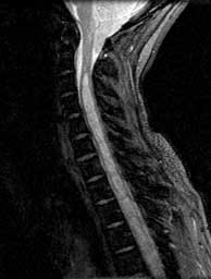 Septated cavity with CSF signal extending form C3 to the conus. Peglike cerebellar tonsils herniated well below the foramen magnum.